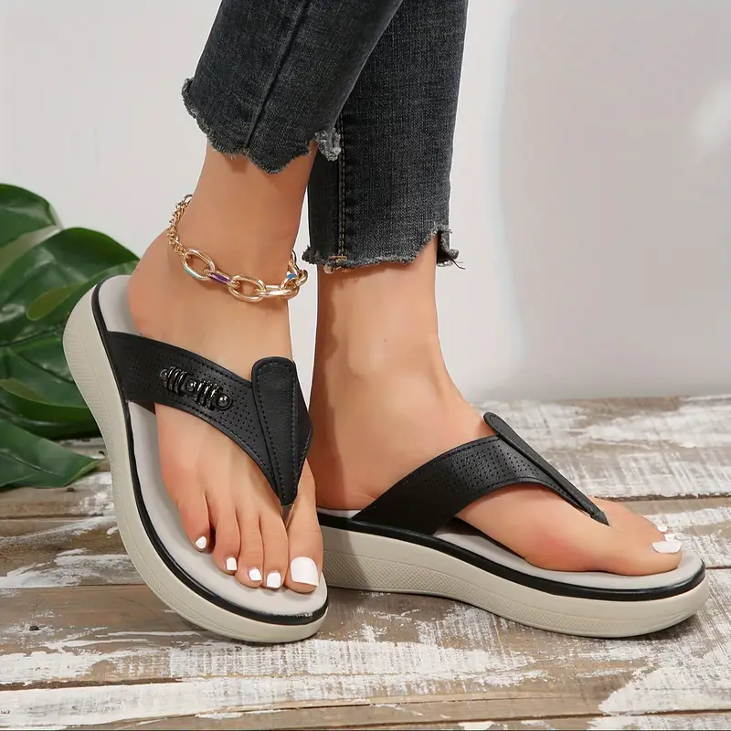 Simply, slip them on and snug your feet in place around the toe clasp for enhanced support.